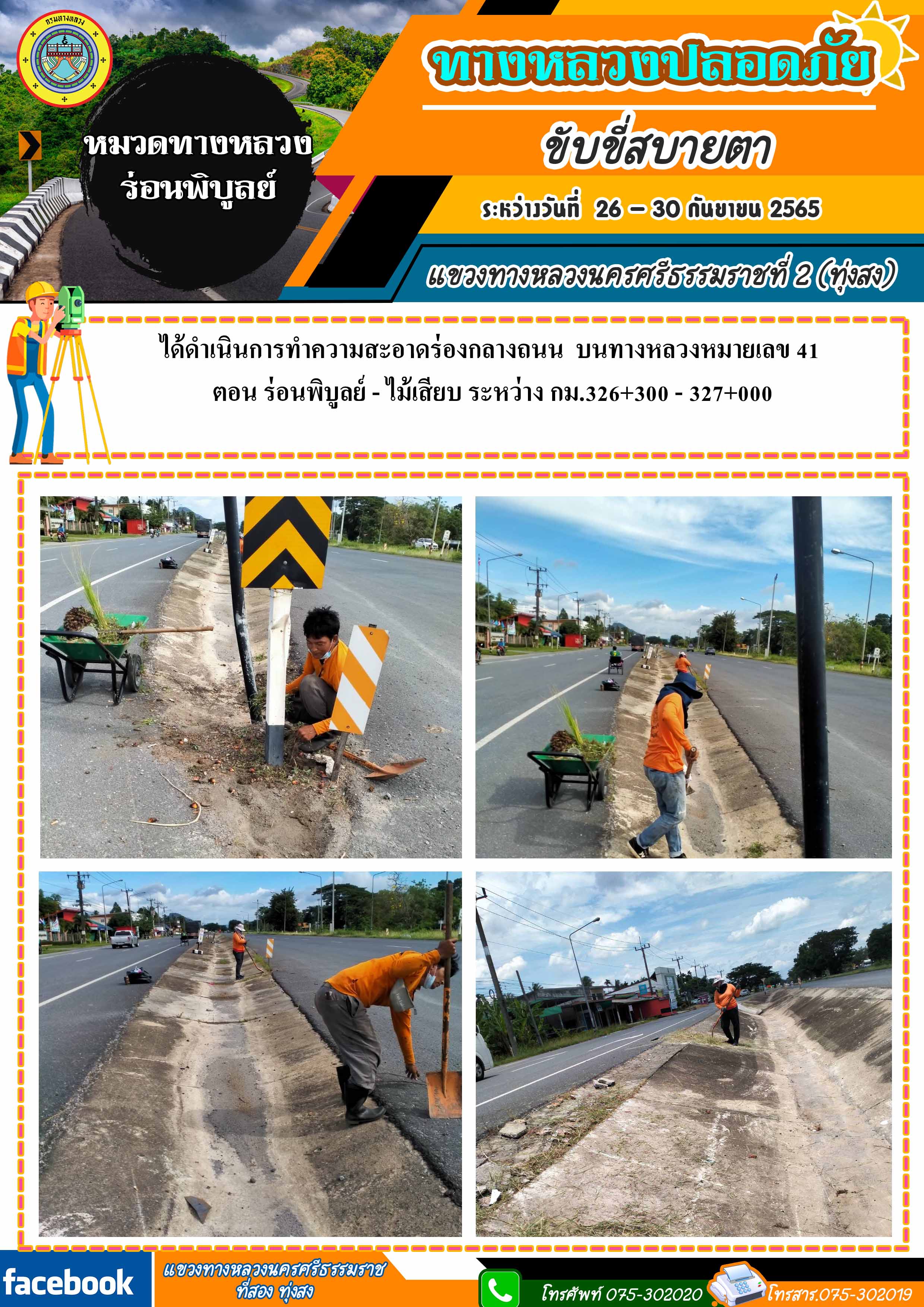290 30/09/2565 ผลการปฏิบัติงานประจำสัปดาห์ของแขวงทางหลวงนครศรีธรรมราชที่ 2 (ทุ่งสง) ระหว่างวันที่ 26 - 30 กันยายน 2565 โดยหมวดทางหลวงและหน่วยงานในสังกัด