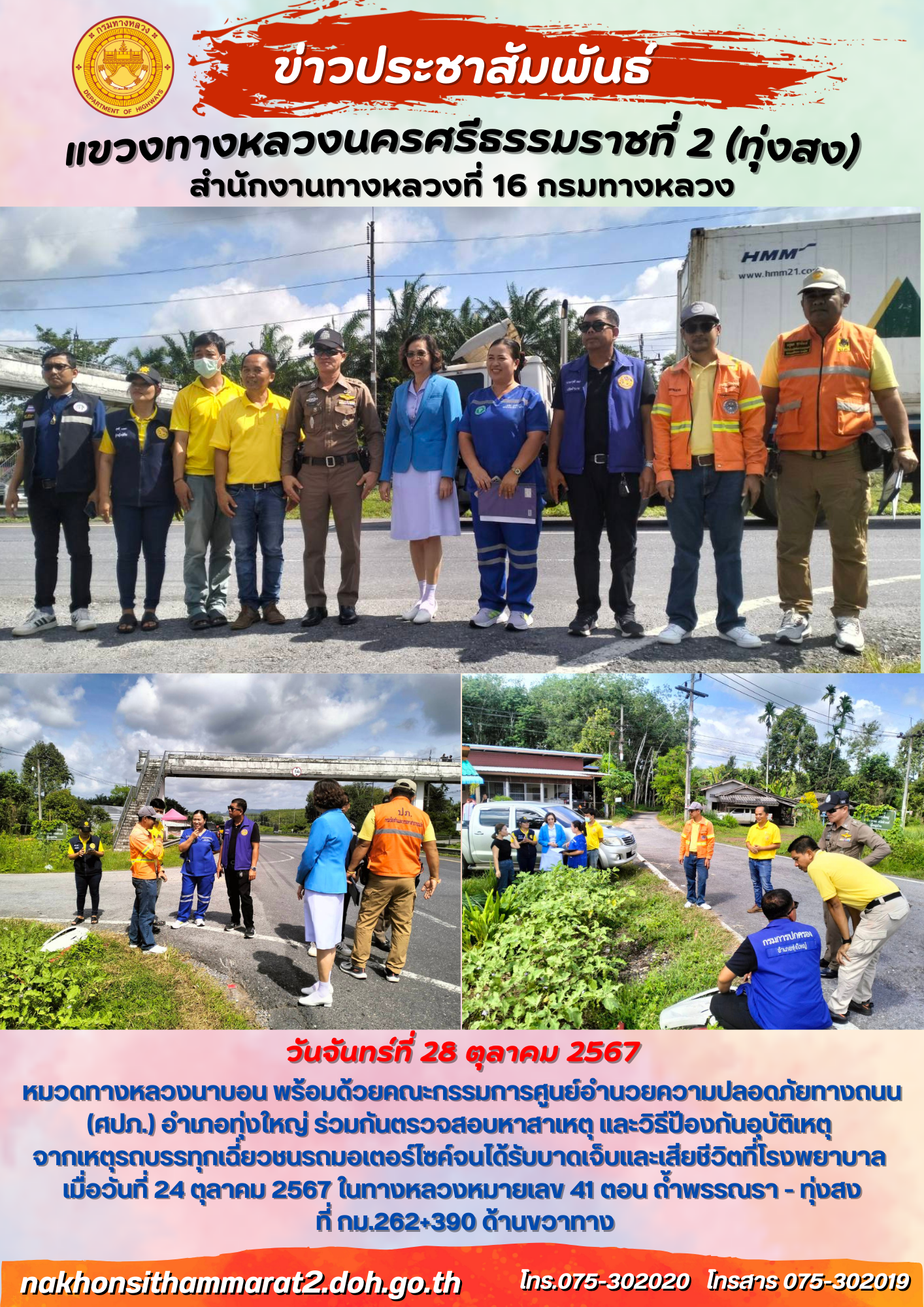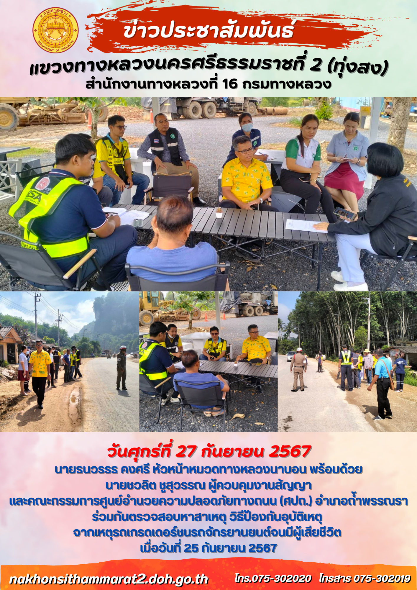 60 27/09/2567 ตรวจสอบหาสาเหตุ วิธีป้องกันอุบัติเหตุ จากเหตุรถเกรดเดอร์ชนรถจักรยานยนต์จนมีผู้เสียชีวิต เมื่อวันที่ 25 กันยายน 2567