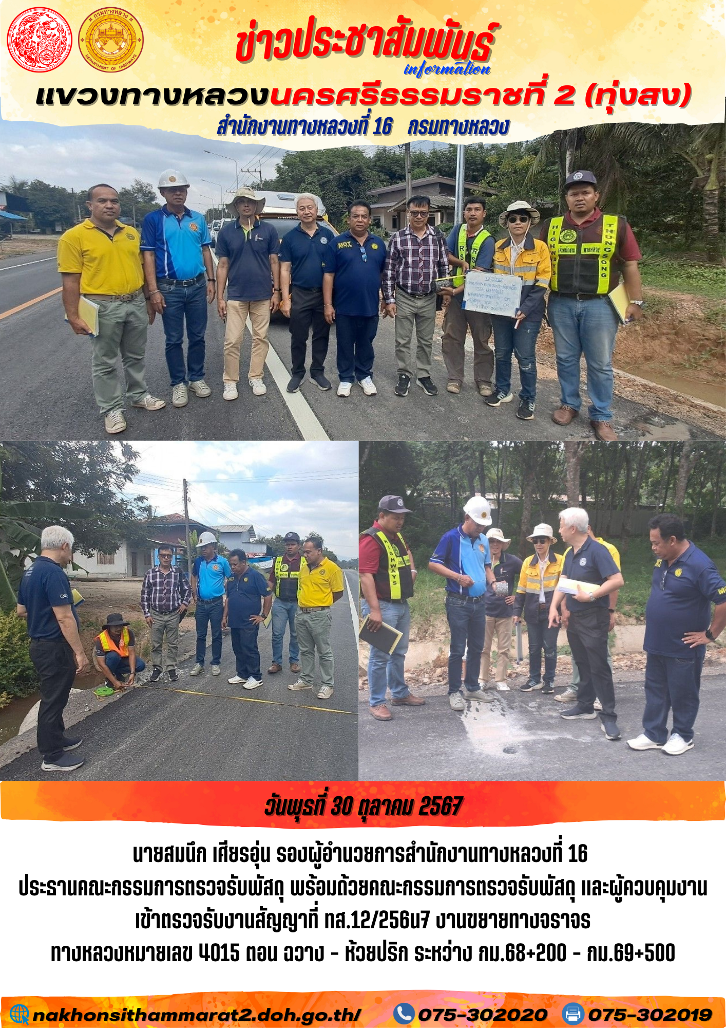 52 01/11/2567 ตรวจรับงานสัญญาที่ ทส.12/2567 งานขยายทางจราจร ทางหลวงหมายเลข 4015 ตอน ฉวาง - ห้วยปริก ระหว่าง กม.68+200 - กม.69+500
