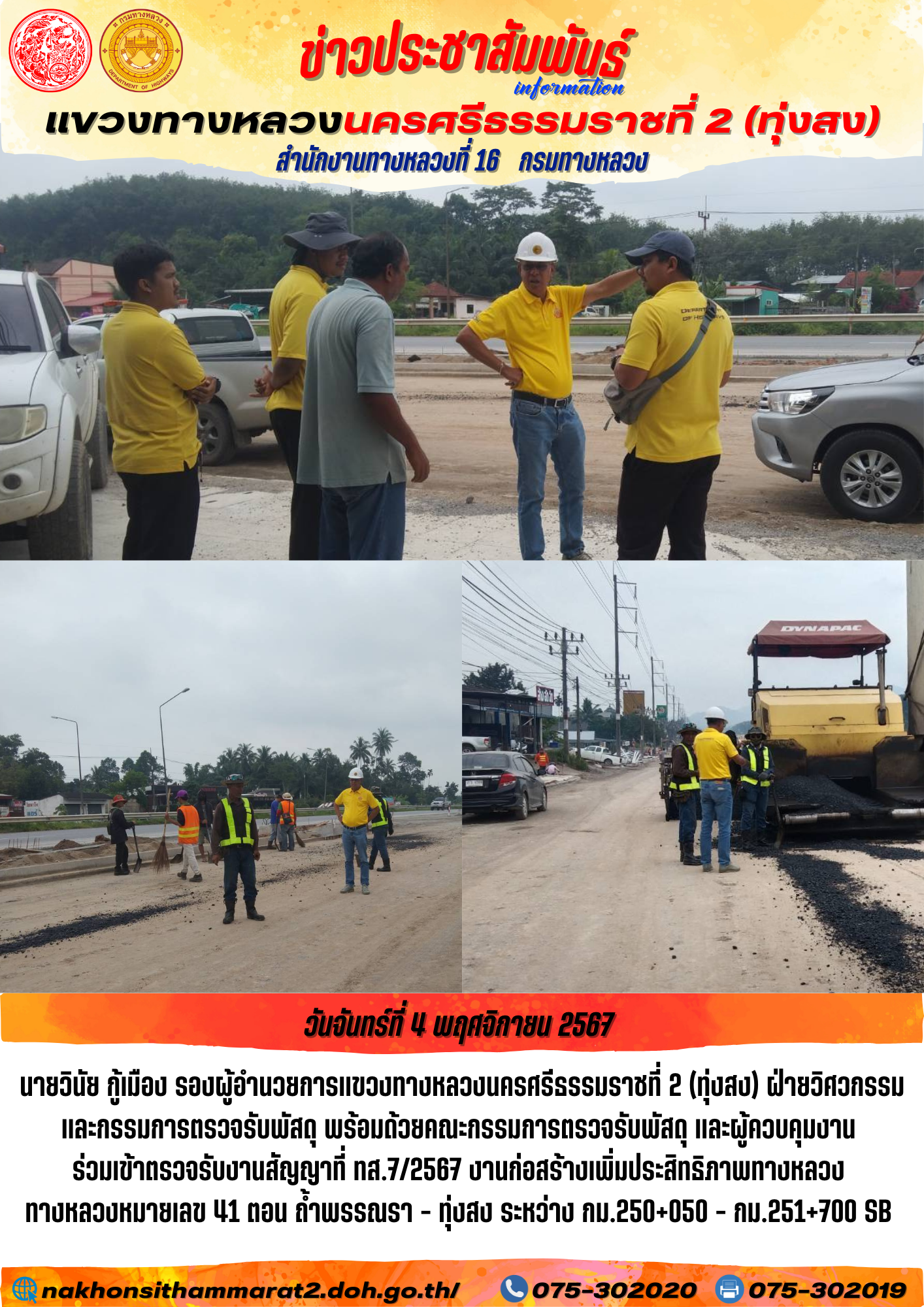 51 04/11/2567 ตรวจรับงานสัญญาที่ ทส.7/2567 งานก่อสร้างเพิ่มประสิทธิภาพทางหลวง ทางหลวงหมายเลข 41 ตอน ถ้ำพรรณรา - ทุ่งสง ระหว่าง กม.250+050 - กม.251+700 SB