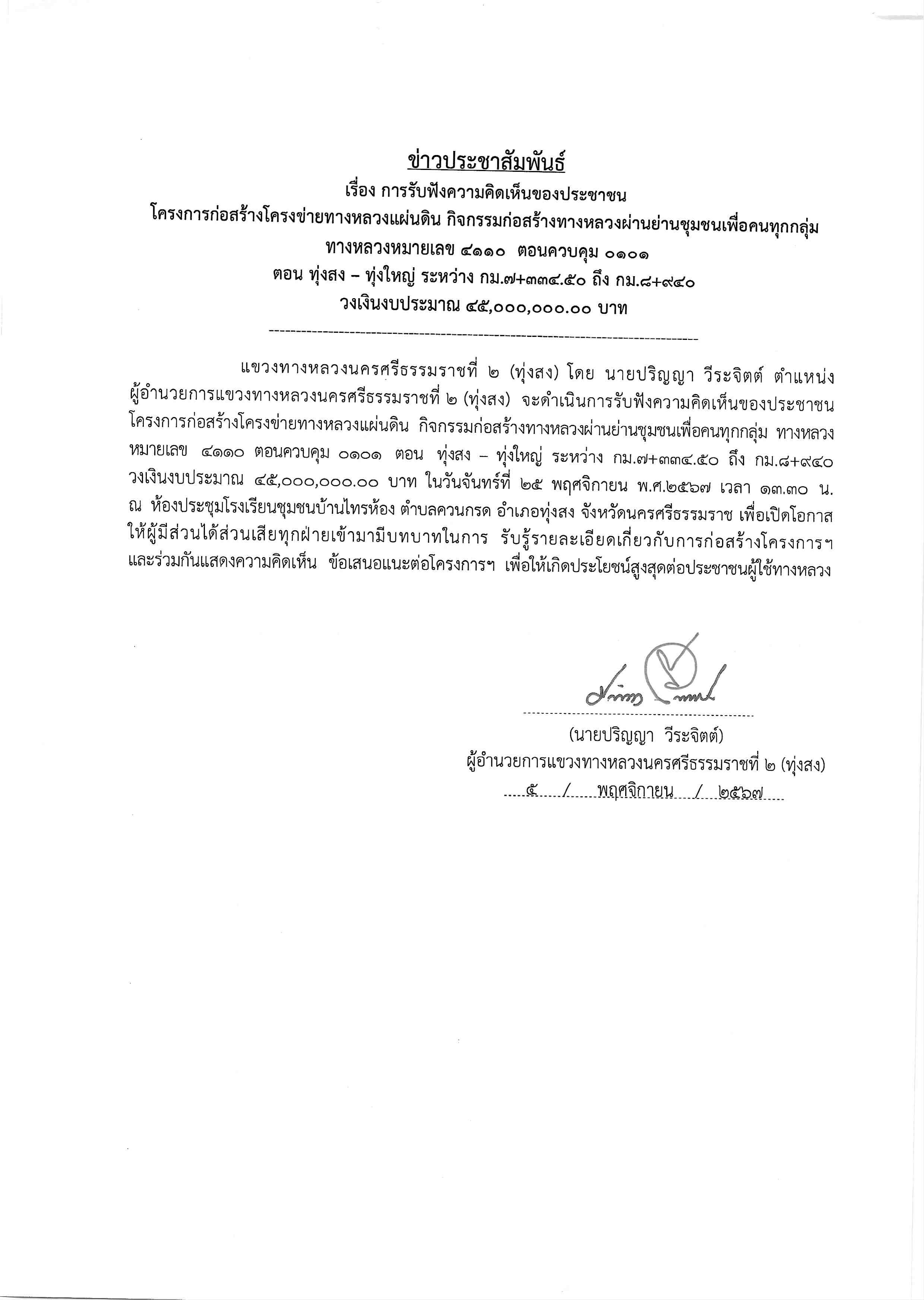 49 05/11/2567 การรับฟังความคิดเห็นของประชาชน โครงการก่อสร้างโครงข่ายทางหลวงแผ่นดิน กิจกรรมก่อสร้างทางหลวงผ่านย่านชุมชนเพื่อคนทุกกลุ่ม ทางหลวงหมายเลข 4110 ตอนควบคุม 0101 ตอน ทุ่งสง - ทุ่งใหญ่ ระหว่าง กม.7.+334.50 - กม.8+940