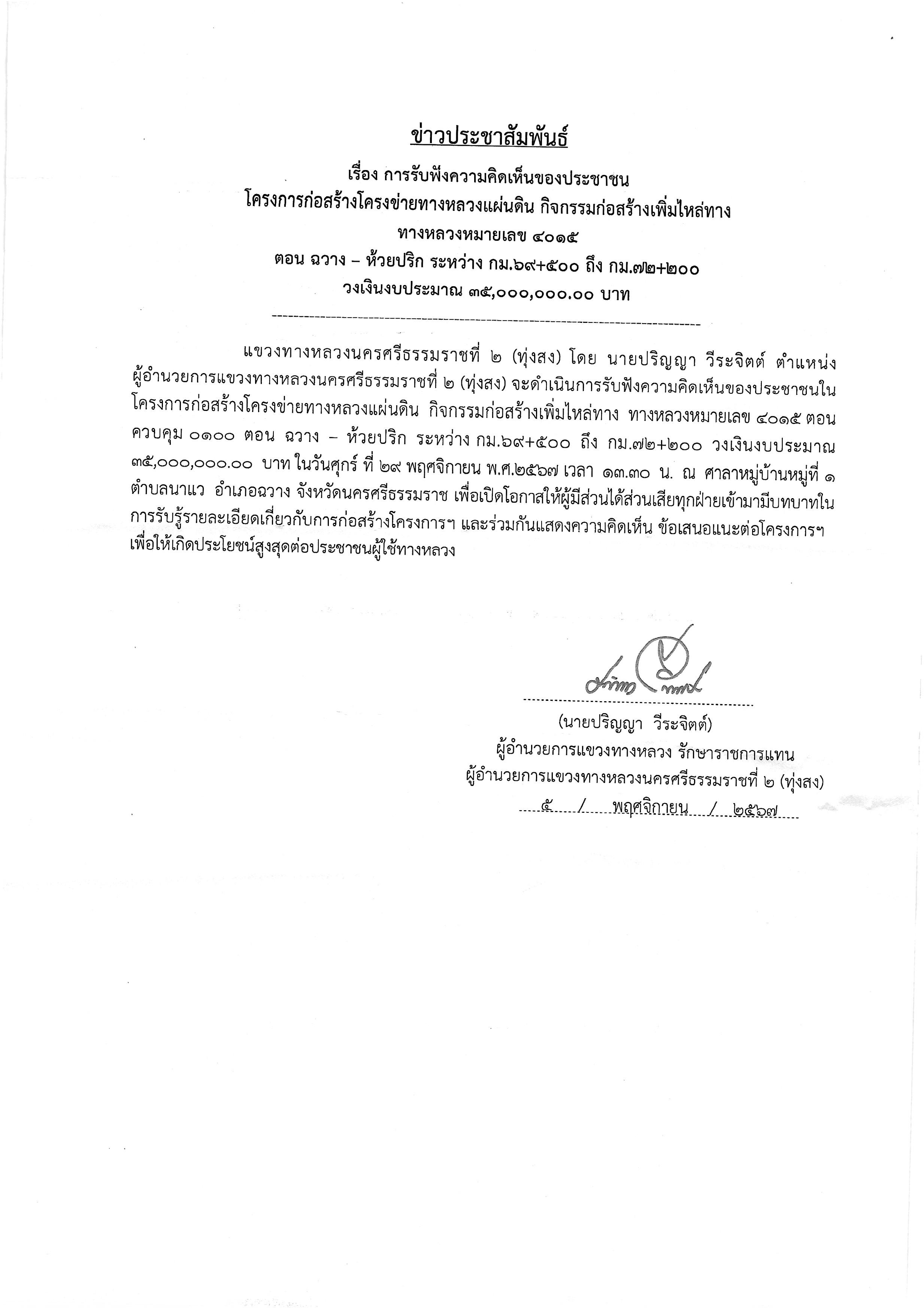 47 05/11/2567 การรับฟังความคิดเห็นของประชาชน โครงการก่อสร้างโครงข่ายทางหลวงแผ่นดิน กิจกรรมก่อสร้างเพิ่มไหล่ทาง งานก่อสร้างเพิ่มไหล่ทาง ทางหลวงหมายเลข 4015 ตอนควบคุม 0202 ตอน ฉวาง - ห้วยปริก ระหว่าง กม.69+500 - กม.72+200