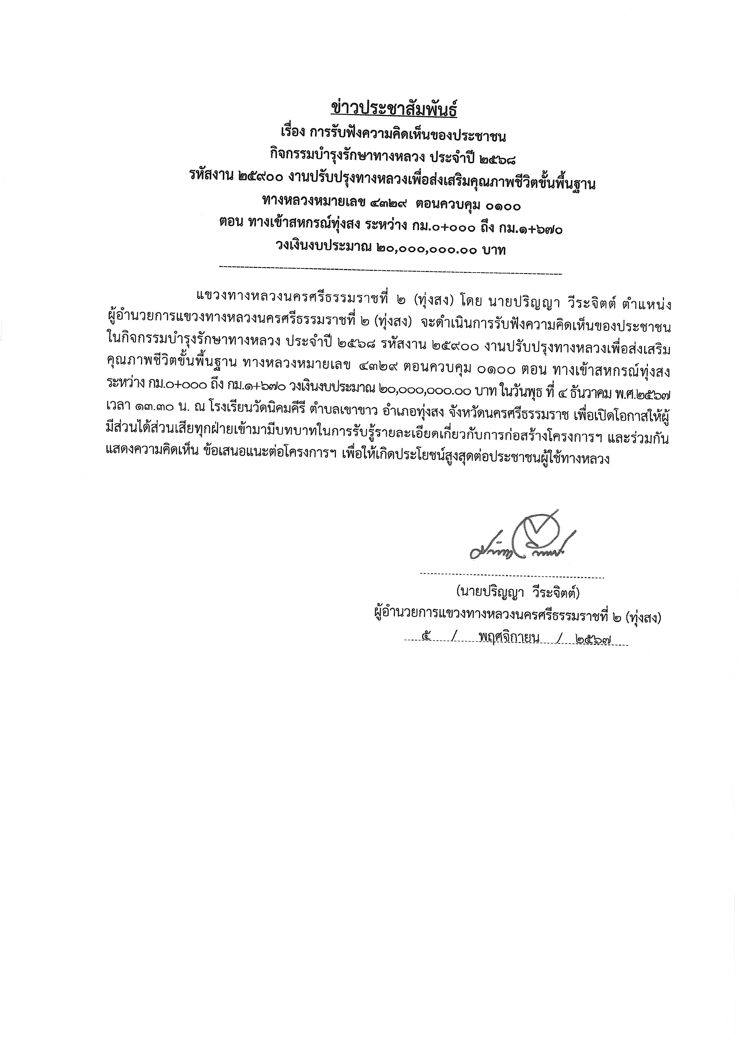 46 05/11/2567 การรับฟังความคิดเห็นของประชาชน ในกิจกรรมบำรุงรักษาทางหลวงประจำปี 2568 รหัสงาน 25900 งานปรับปรุงทางหลวงเพื่อส่งเสริมคุณภาพชีวิตขั้นพื้นฐาน ทางหลวงหมายเลข 4329 ตอนควบคุม 0100 ตอน ทางเข้าสหกรณ์ทุ่งสง ระหว่าง กม.0+000 - กม.1+670