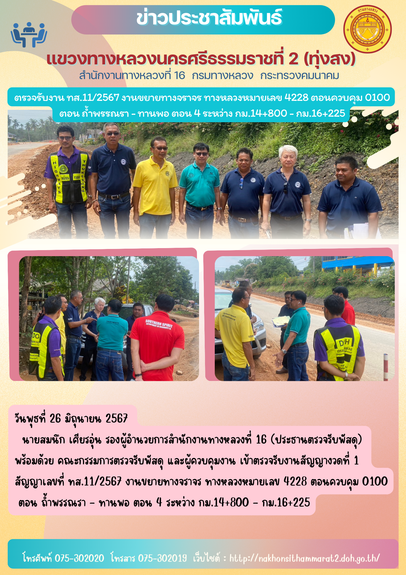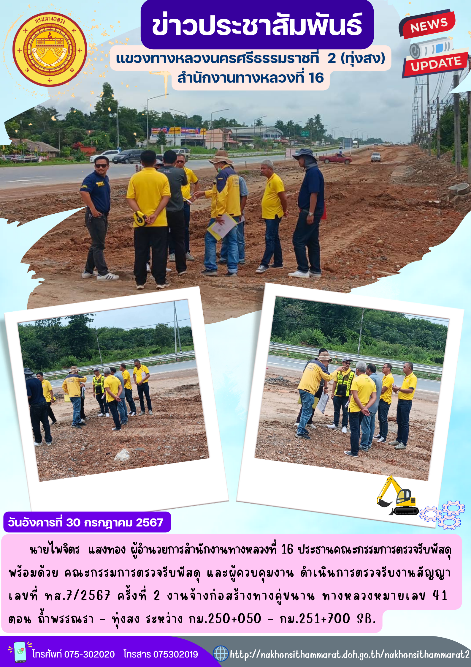 ตรวจรับงานสัญญาเลขที่ ทส.7/2567 ครั้งที่ 2 งานก่อสร้างทางคู่ขนาน ทางหลวงหมายเลข 41 ตอน ถ้ำพรรณรา - ทุ่งสง ระหว่าง กม.250+050 - กม.251+700 SB