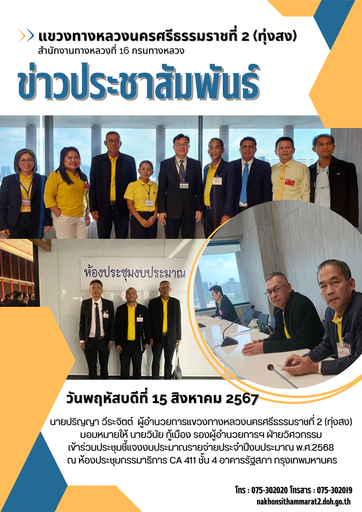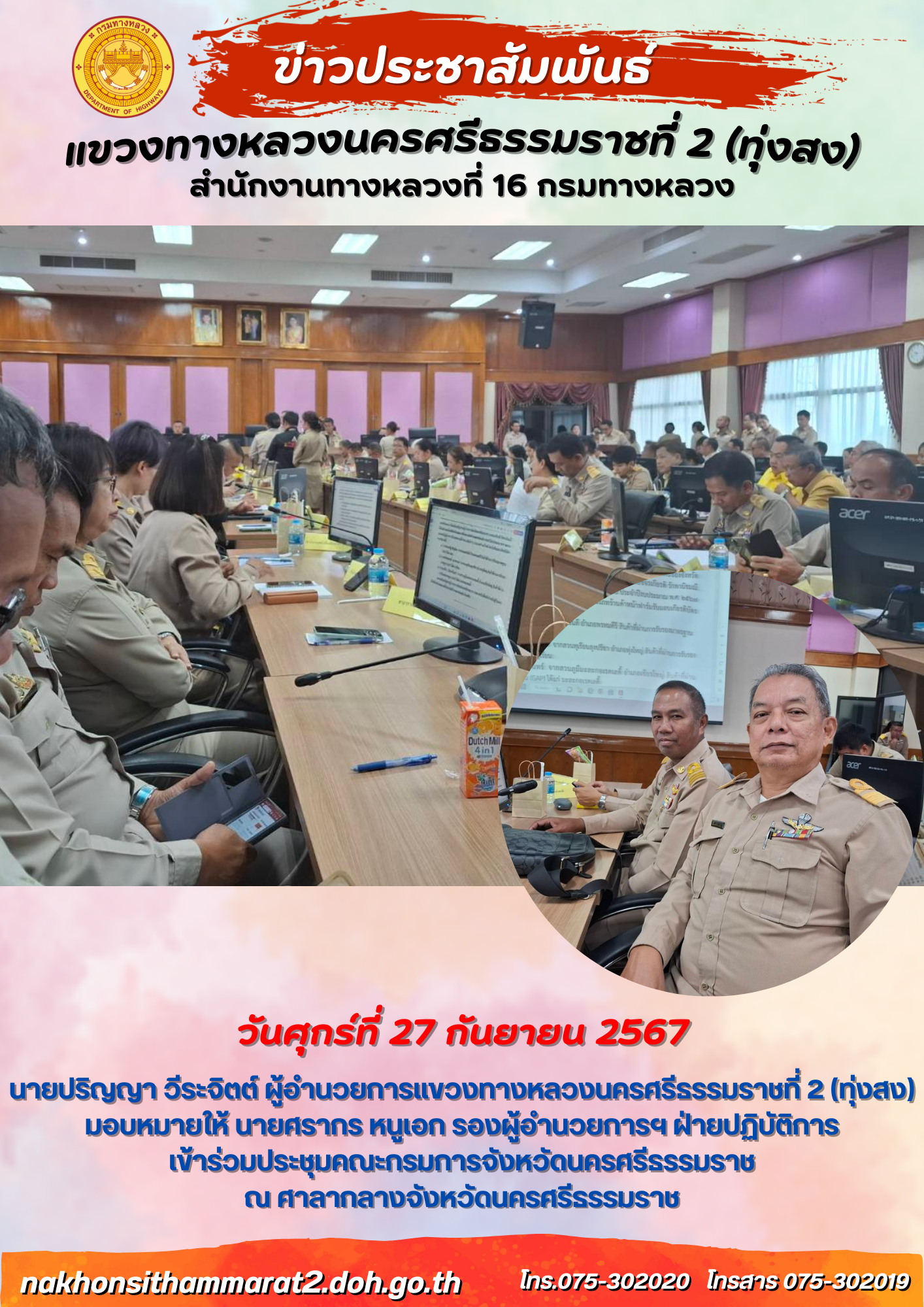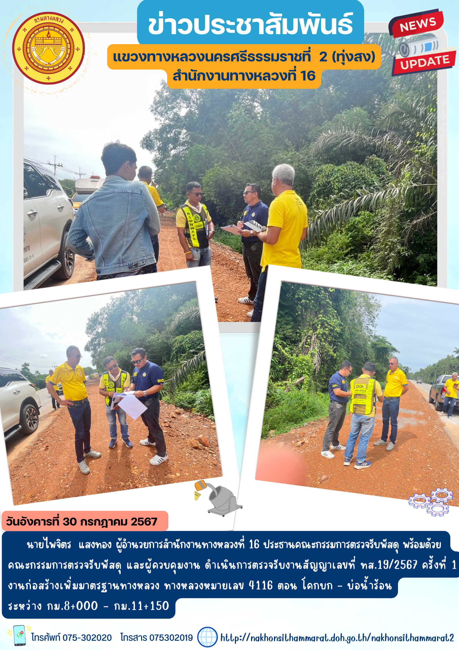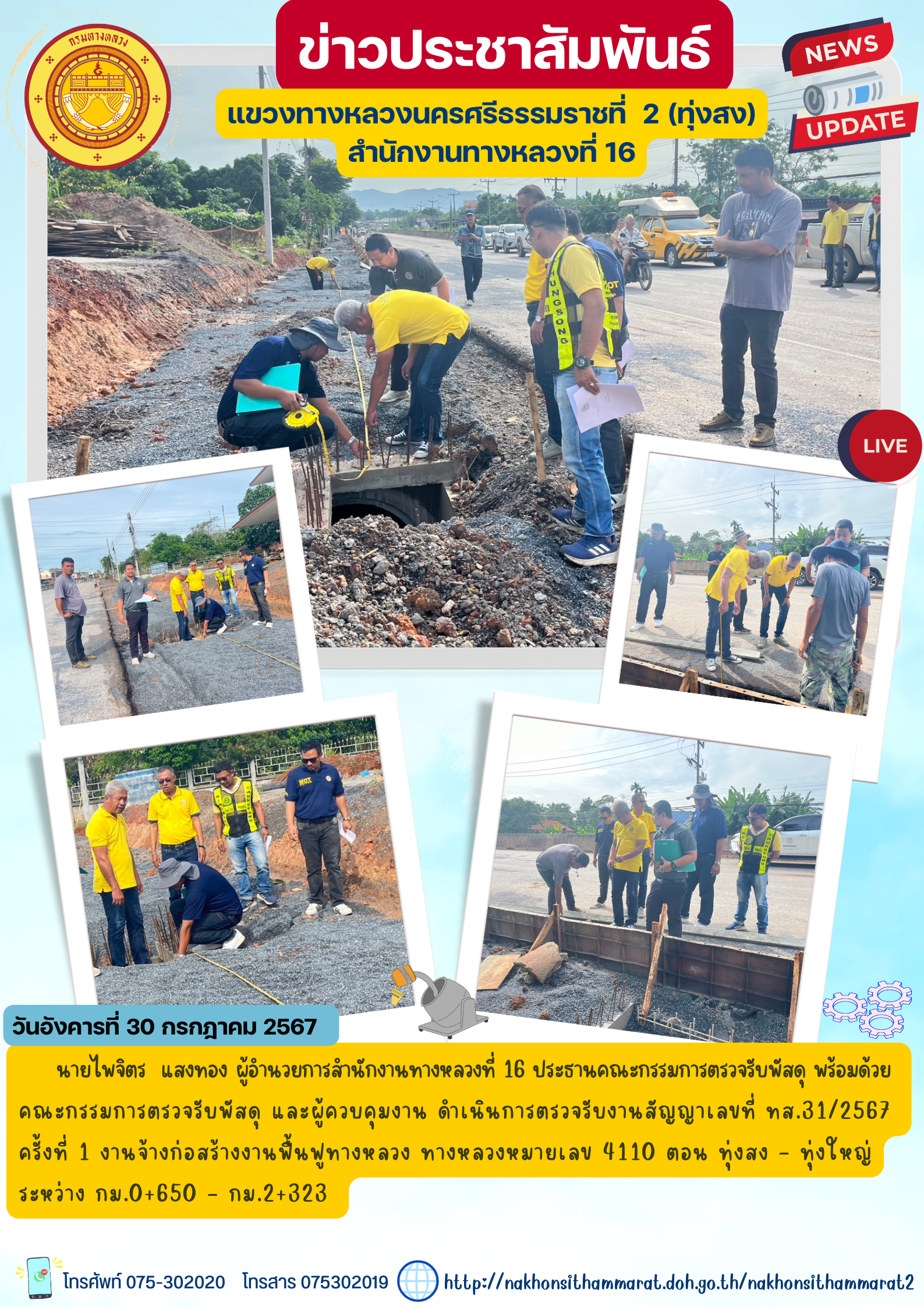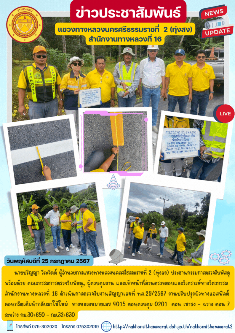 ารตรวจรับงานสัญญาเลขที่ ทส.29/2567 งานปรับปรุงผิวทางแอสฟัลต์คอนกรีตเดิมนำกลับมาใช้ใหม่ ทางหลวงหมายเลข 4015 ตอนควบคุม 0201 ตอน เขาธง - ฉวาง ตอน 7 ระหว่าง กม.30+650 - กม.32+630