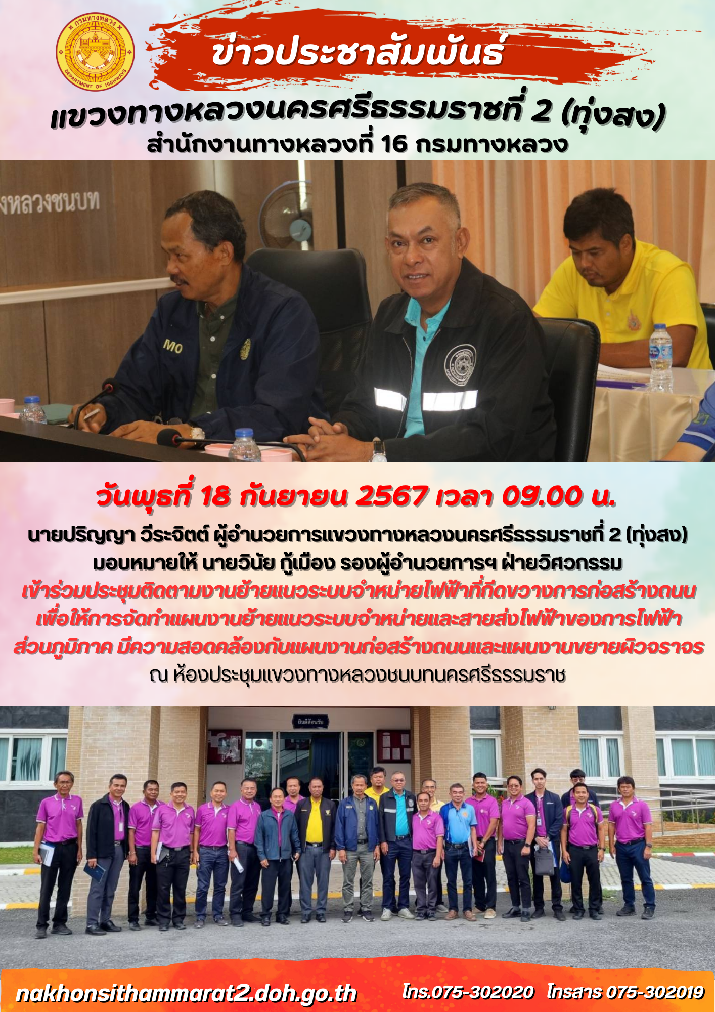 ประชุมติดตามงานย้ายแนวระบบจำหน่ายไฟฟ้าที่กีดขวางการก่อสร้างถนน เพื่อให้การจัดทำแผนงานย้ายแนวระบบจำหน่ายและสายส่งไฟฟ้าของการไฟฟ้า ส่วนภูมิภาค มีความสอดคล้องกับแผนงานก่อสร้างถนนและแผนงานขยายผิวจราจร
