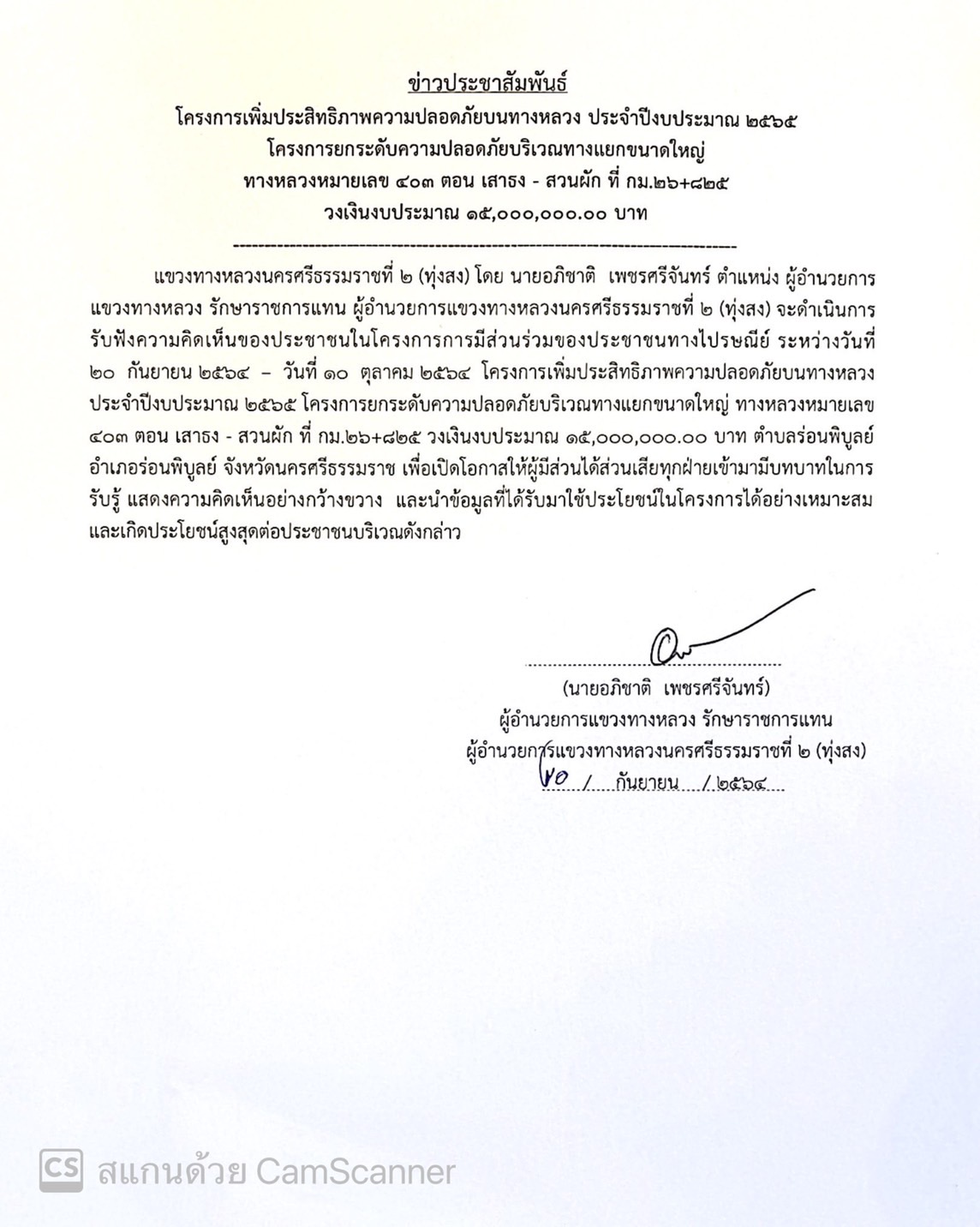 นายอภิชาติ เพชรศรีจันทร์ ตำแหน่ง ผู้อำนวยการแขวงทางหลวง รักษาราชการแทน ผู้อำนวยการแขวงทางหลวงนครศรีธรรมราชที่ 2 (ทุ่งสง) จะดำเนินการ รับฟังความคิดเห็นของประชาชนในโครงการการมีส่วนร่วมของประชาชนทางไปรษณีย์ ระหว่างวันที่ 20 กันยายน 2564 – วันที่ 10 ตุลาคม 2564 โครงการเพิ่มประสิทธิภาพความปลอดภัยบนทางหลวง ประจำปีงบประมาณ 2565 โครงการยกระดับความปลอดภัยบริเวณทางแยกขนาดใหญ่ ทางหลวงหมายเลข 403 ตอน เสาธง - สวนผัก ที่ กม.26+825 วงเงินงบประมาณ 15,000,000.00 บาท ตำบลร่อนพิบูลย์ อำเภอร่อนพิบูลย์ จังหวัดนครศรีธรรมราช เพื่อเปิดโอกาสให้ผู้มีส่วนได้ส่วนเสียทุกฝ่ายเข้ามามีบทบาทในการรับรู้ แสดงความคิดเห็นอย่างกว้างขวาง และนำข้อมูลที่ได้รับมาใช้ประโยชน์ในโครงการได้อย่างเหมาะสม และเกิดประโยชน์สูงสุดต่อประชาชนบริเวณดังกล่าว
