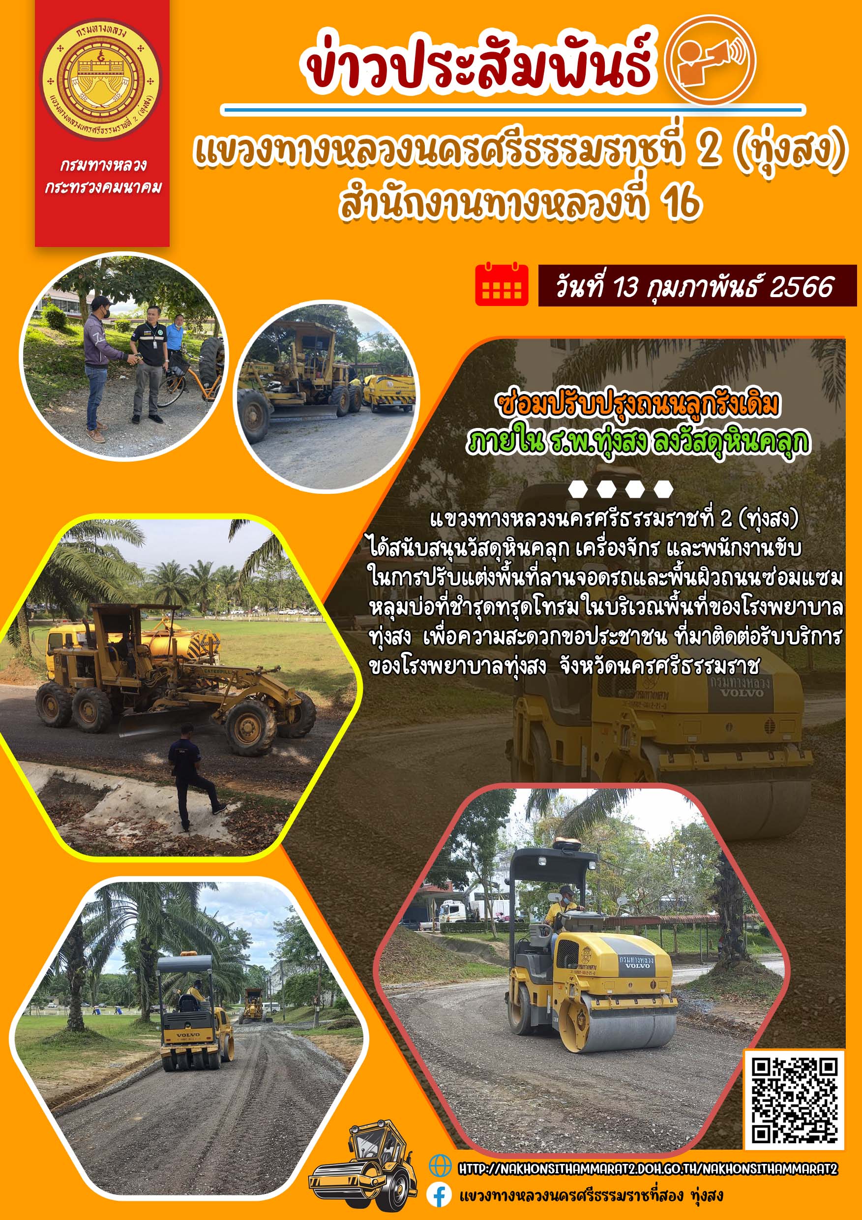 แขวงทางหลวงนครศรีธรรมราชที่ 2 (ทุ่งสง) ได้สนับสนุนวัสดุหินคลุกพร้อมด้วยเครื่องจักรและพนักงานขับ ในการปรับแต่งพื้นที่ลานจอดรถและพื้นผิวถนน ซ่อมแซมหลุมบ่อที่ชำรุดทรุดโทรม ในบริเวณพื้นที่ของโรงพยาบาลทุ่งสง เพื่อความสะดวกของประชาชนที่มาติดต่อรับบริการของโรงพยาบาลทุ่งสง อำเภอทุ่งสง จังหวัดนครศรีธรรมราช