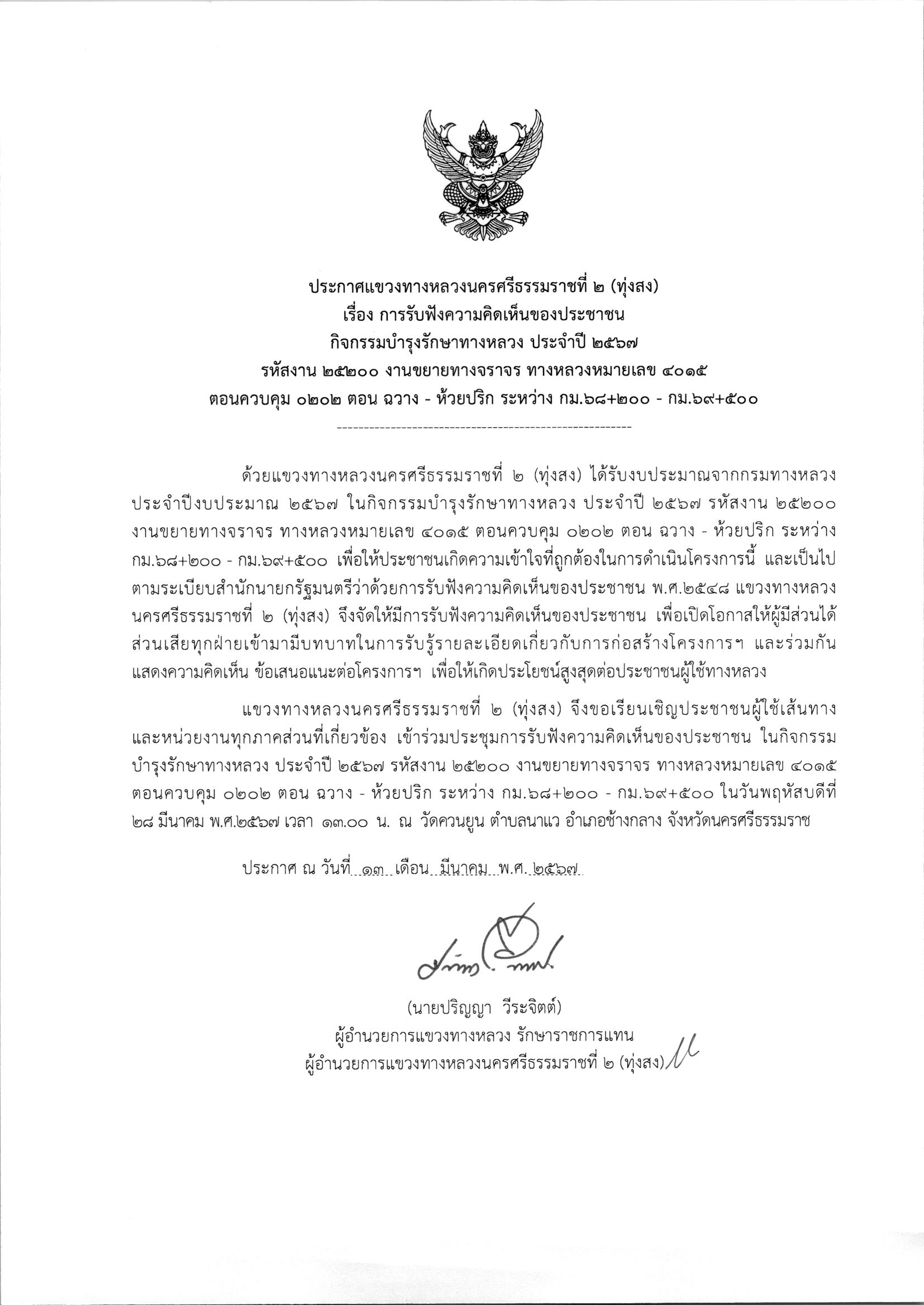 จะดำเนินการรับฟังความคิดเห็นของประชาชนในกิจกรรมบำรุงรักษาทางหลวง ประจำปี 2567 รหัสงาน 25200 งานขยายทางจราจร ทางหลวงหมายเลข 4015 ตอนควบคุม 0202 ตอน ฉวาง - ห้วยปริก ระหว่าง กม.68+200 - กม.69+500 ในวันพฤหัสบดีที่ 28 มีนาคม พ.ศ.2567 เวลาe13.00 น. ณ วัดควนยูน ตำบลนาแว อำเภอช้างกลาง จังหวัดนครศรีธรรมราช เพื่อเปิดโอกาสให้ผู้มีส่วนได้ส่วนเสียทุกฝ่ายเข้ามามีบทบาทในการรับรู้รายละเอียดเกี่ยวกับการก่อสร้างโครงการฯ และร่วมกันแสดงความคิดเห็น ข้อเสนอแนะต่อโครงการฯ เพื่อให้เกิดประโยชน์สูงสุดต่อประชาชนผู้ใช้ทางหลวง