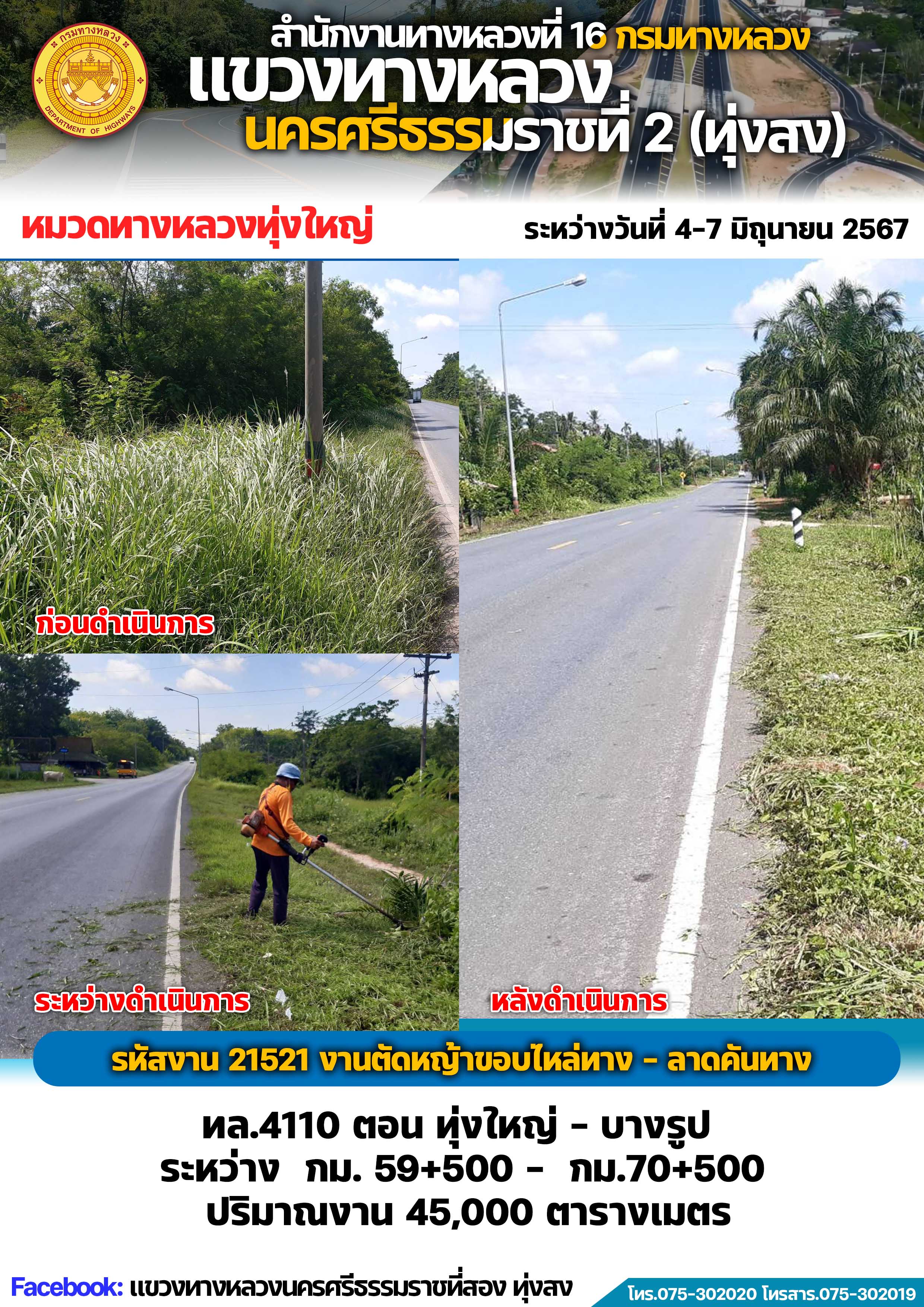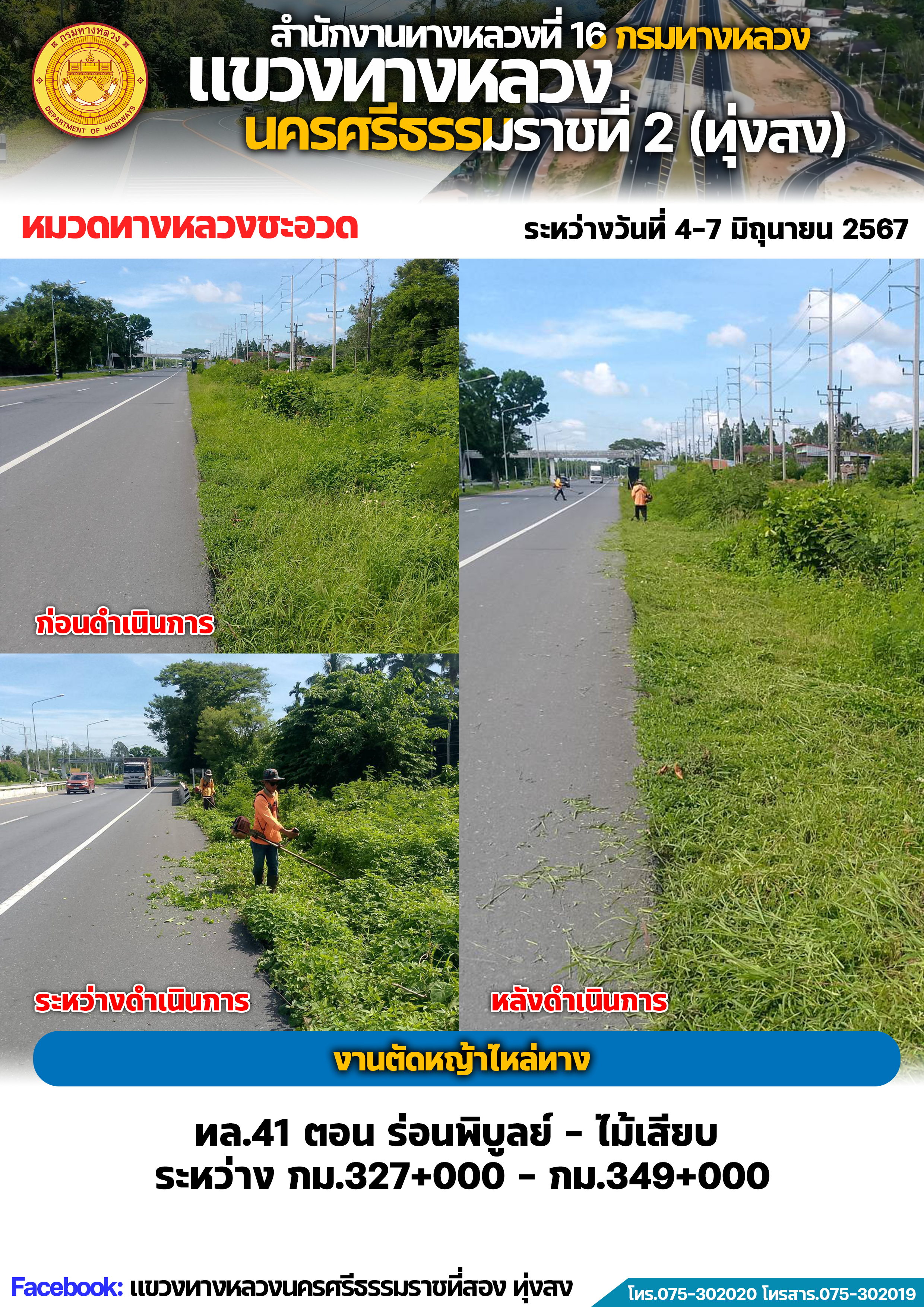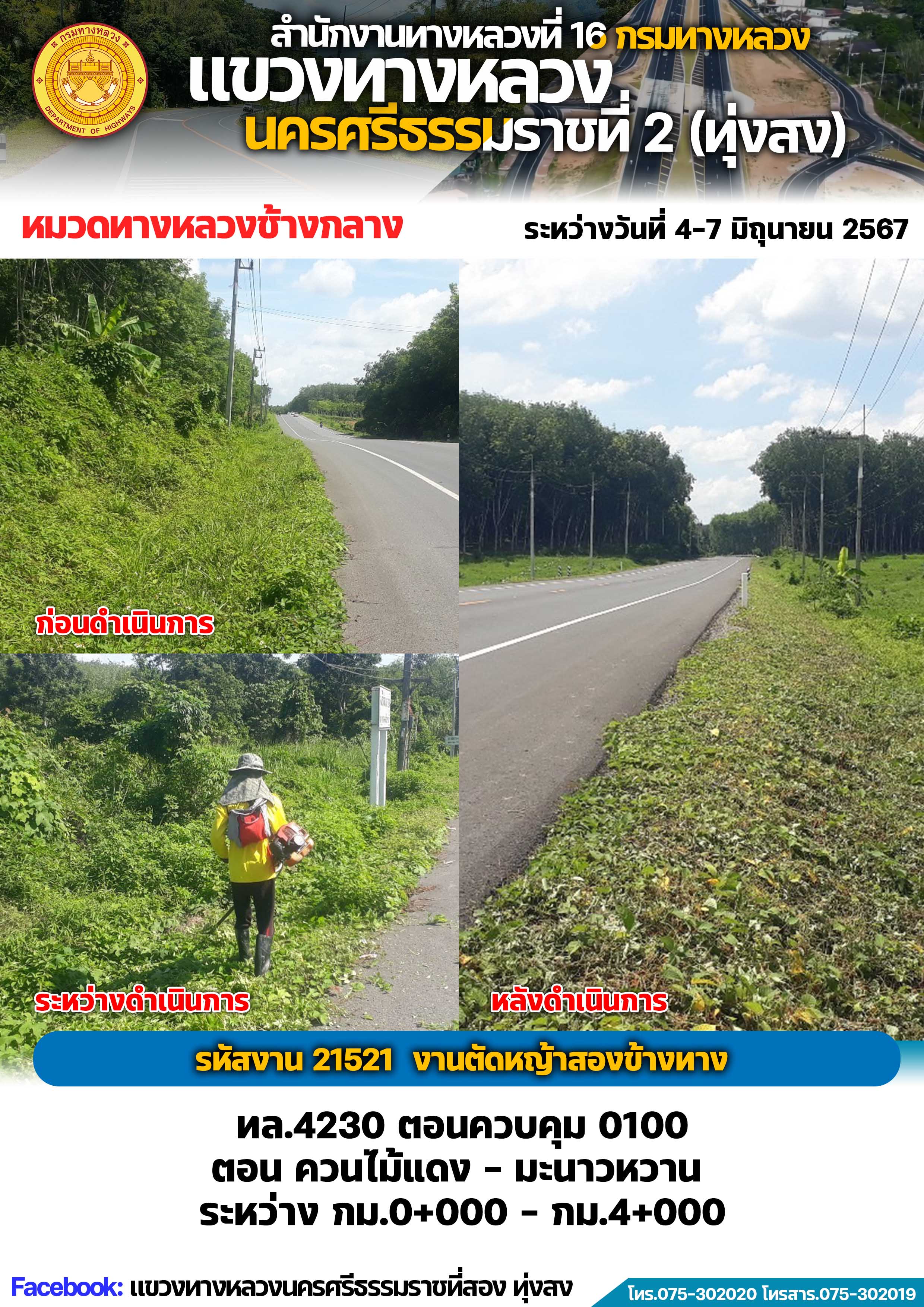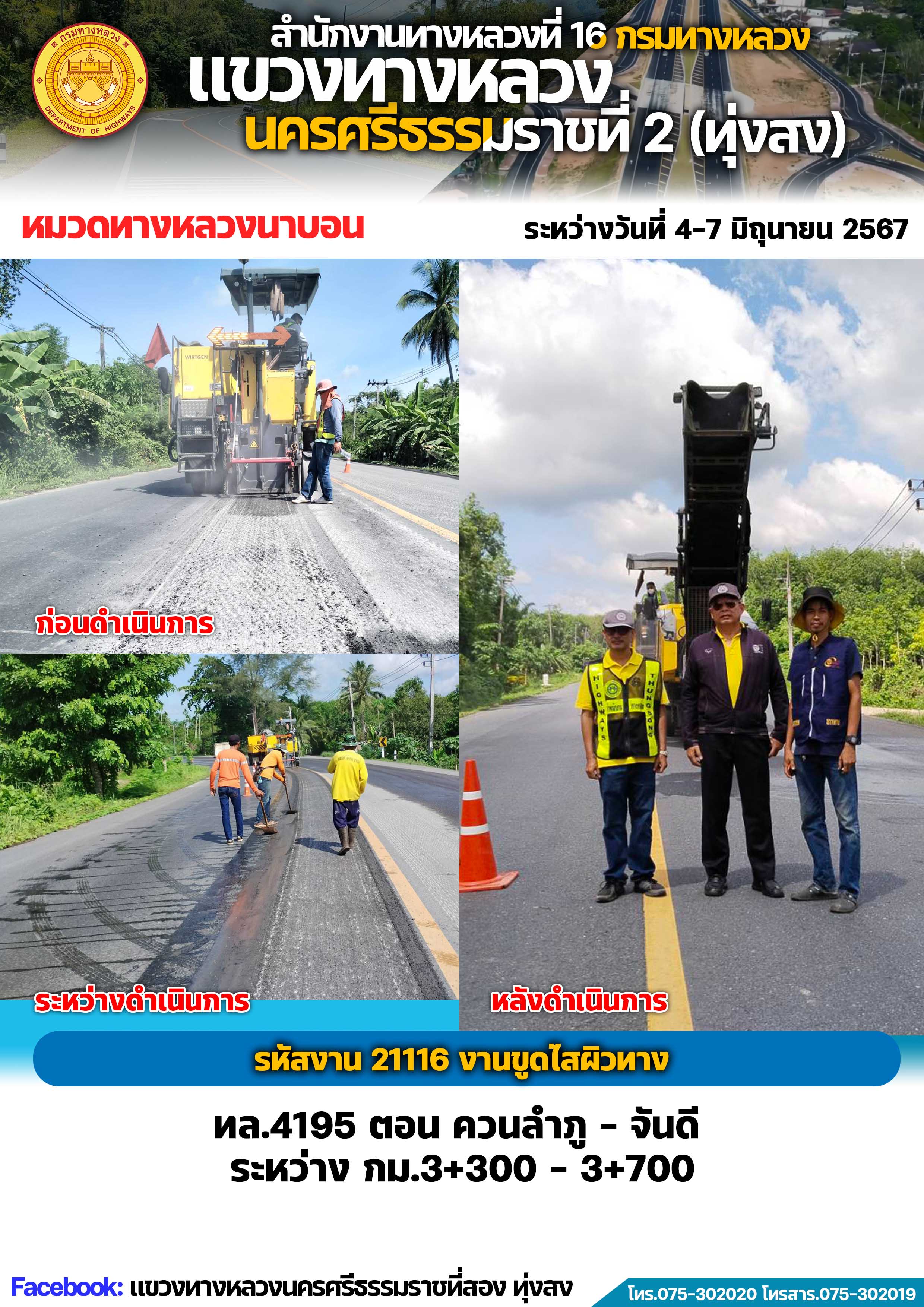 ผลการปฏิบัติงานของหมวดทางหลวงและหน่วยงานในสังกัด แขวงทางหลวงนครศรีธรรมราชที่ 2 (ทุ่งสง) ระหว่างวันที่ 4-7 มิถุนายน พ.ศ.2567