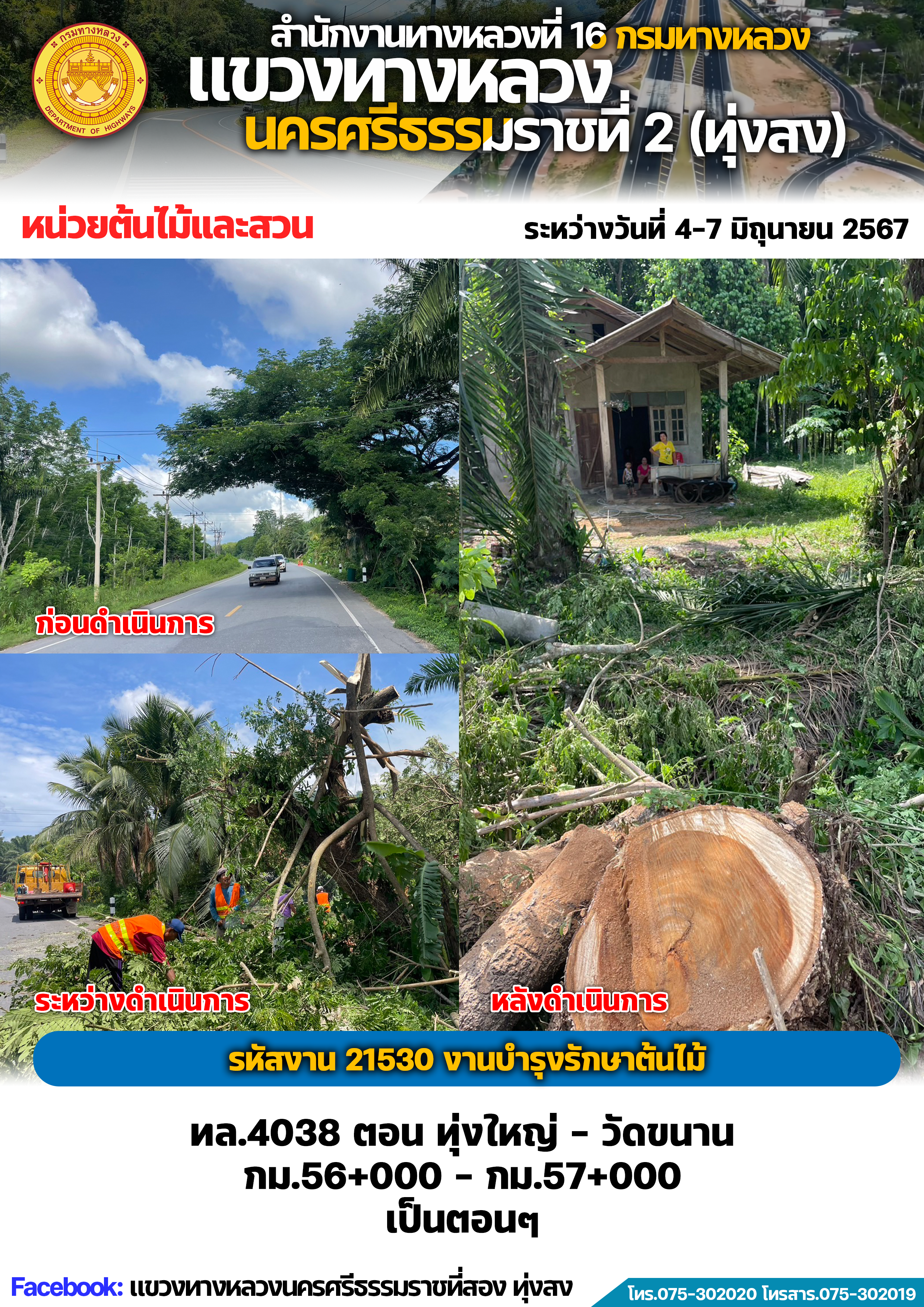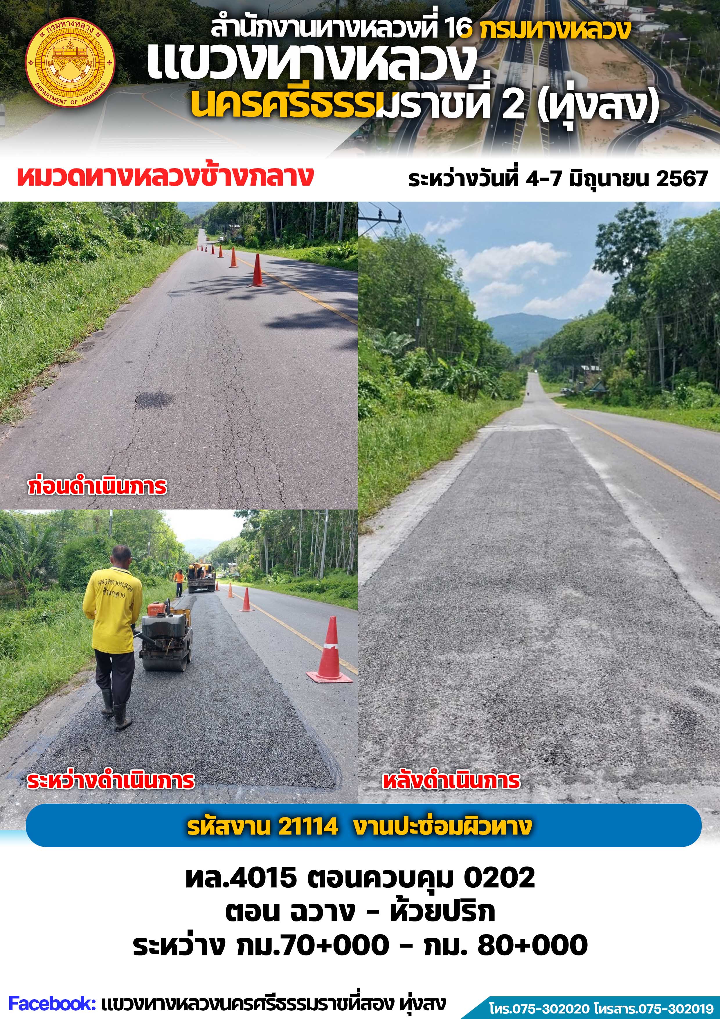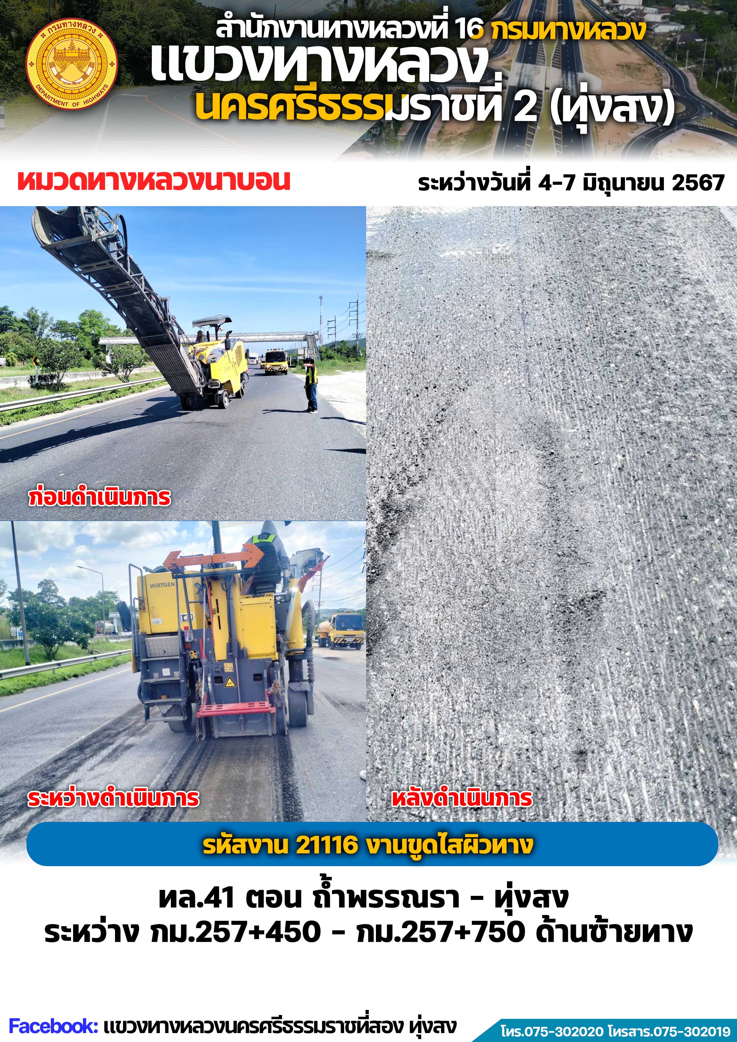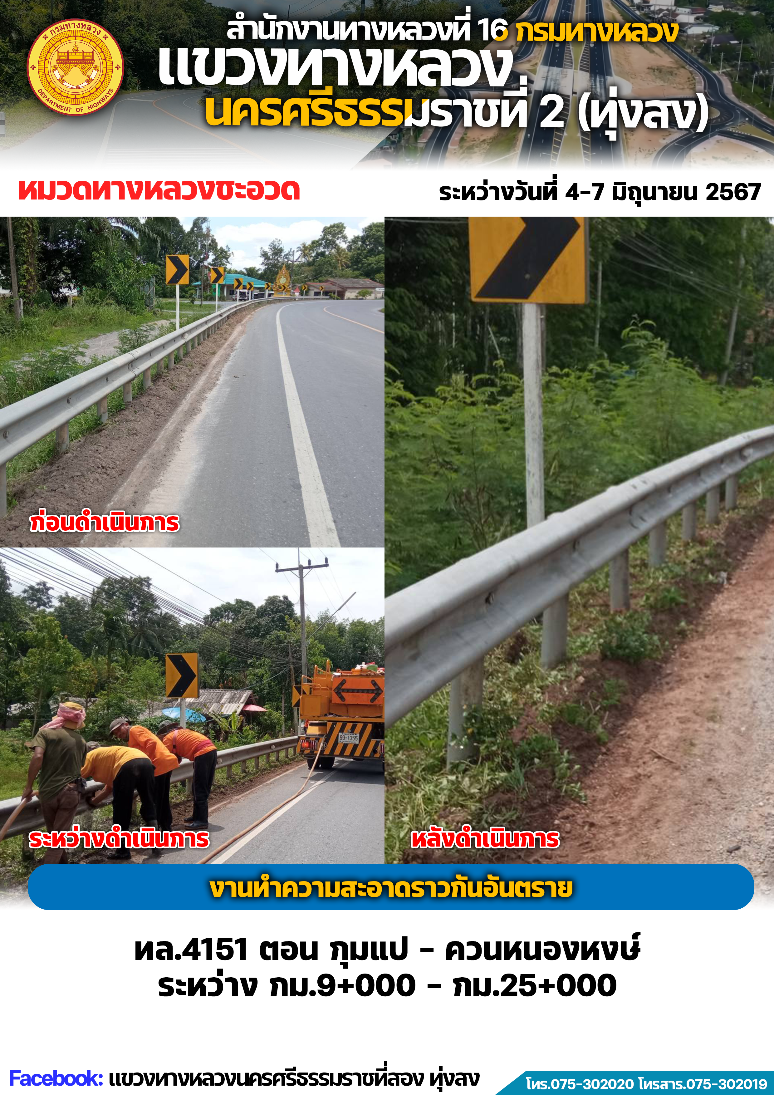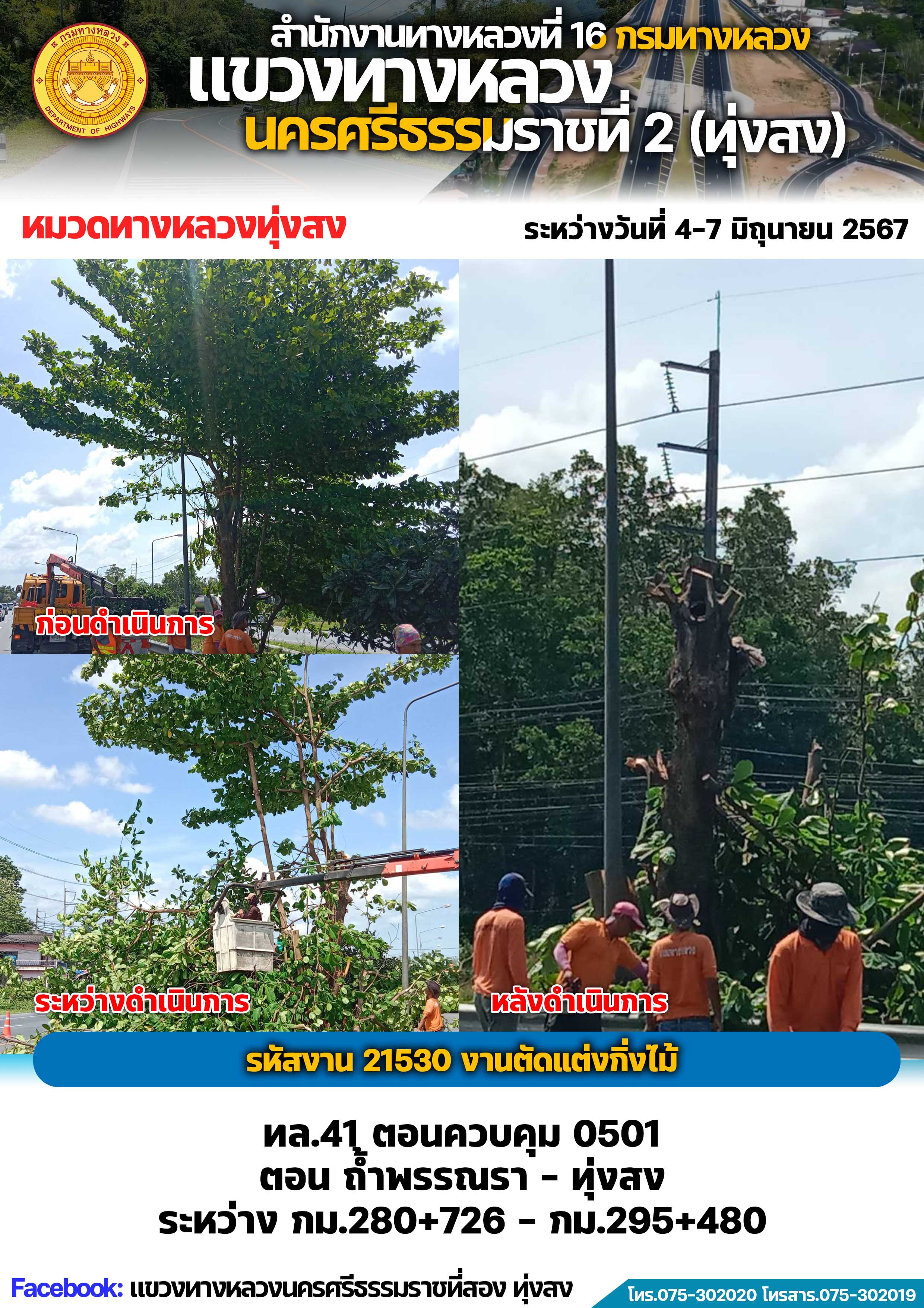 ผลการปฏิบัติงานของหมวดทางหลวงและหน่วยงานในสังกัด แขวงทางหลวงนครศรีธรรมราชที่ 2 (ทุ่งสง) ระหว่างวันที่ 4-7 มิถุนายน พ.ศ.2567