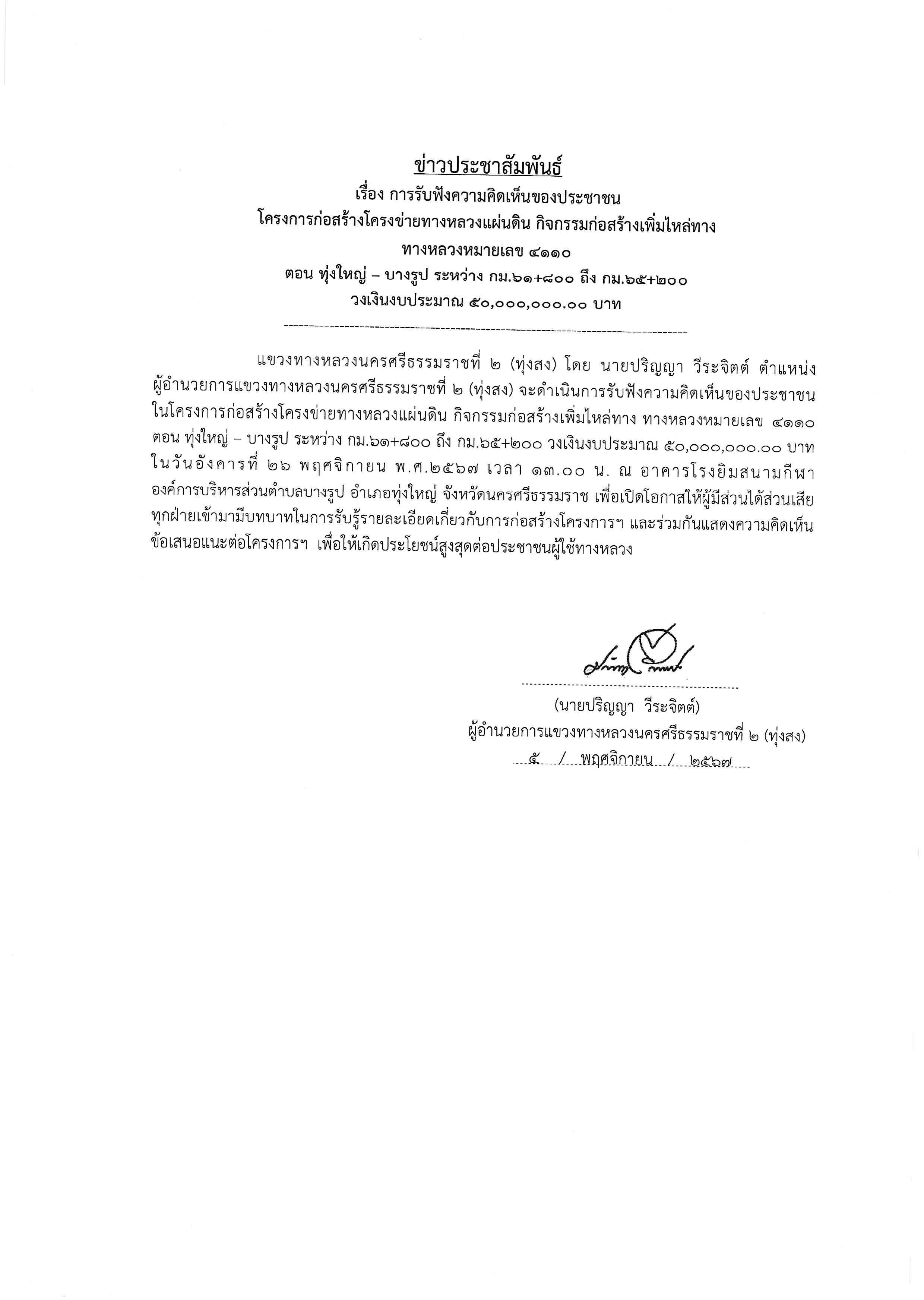 แขวงทางหลวงนครศรีธรรมราชที่ 2 (ทุ่งสง) โดยนายปริญญา วีระจิตต์ ตำแหน่งผู้อำนวยการแขวงทางหลวงนครศรีธรรมราชที่ 2 (ทุ่งสง) จะดำเนินการรับฟังความคิดเห็นของประชาชน โครงการก่อสร้างโครงข่ายทางหลวงแผ่นดิน กิจกรรมก่อสร้างเพิ่มไหล่ทาง ทางหลวงหมายเลข 4110 ตอนควบคุม 0102 ตอน ทุ่งใหญ่ - บางรูป ระหว่าง กม.61+800 ถึง กม.65+200 วงเงินงบประมาณ 50,000,000.00 บาท ในนวันจันทร์ที่ 26 พฤศจิกายน พ.ศ.2567 เวลา 13.30 น. ให้ผู้มีส่วนได้ส่วนเสียทุกฝ่ายเข้ามามีบทบาทในการรับรู้รายละเอียดเกี่ยวกับการก่อสร้างโครงการฯ และร่วมกันแสดงความคิดเห็น ข้อเสนอแนะต่อโครงการฯ เพื่อให้เกิดประโยชน์สูงสุดต่อประชาชนผู้ใช้ทางหลวง