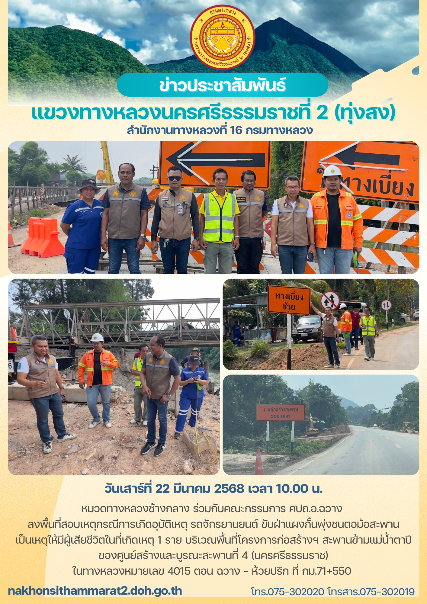 ลงพื้นที่สอบเหตุกรณีการเกิดอุบัติเหตุ รถจักรยานยนต์ ขับฝ่าแผงกั้นพุ่งชนตอม้อสะพาน เป็นเหตุให้มีผู้เสียชีวิตในที่เกิดเหตุ 1 ราย บริเวณพื้นที่โครงการก่อสร้างฯ สะพานข้ามแม่น้ำตาปี ของศูนย์สร้างและบูรณะสะพานที่ 4 (นครศรีธรรมราช)